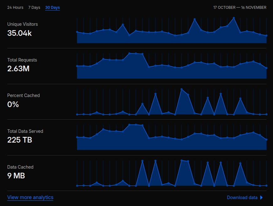 These are the current Cloudflare analytics for people downloading the Argos Translate models. 35k unique downloaders in a month. I’m also using 225TB a month of bandwidth basically for free (I only pay for the domain) with Cloudflare.