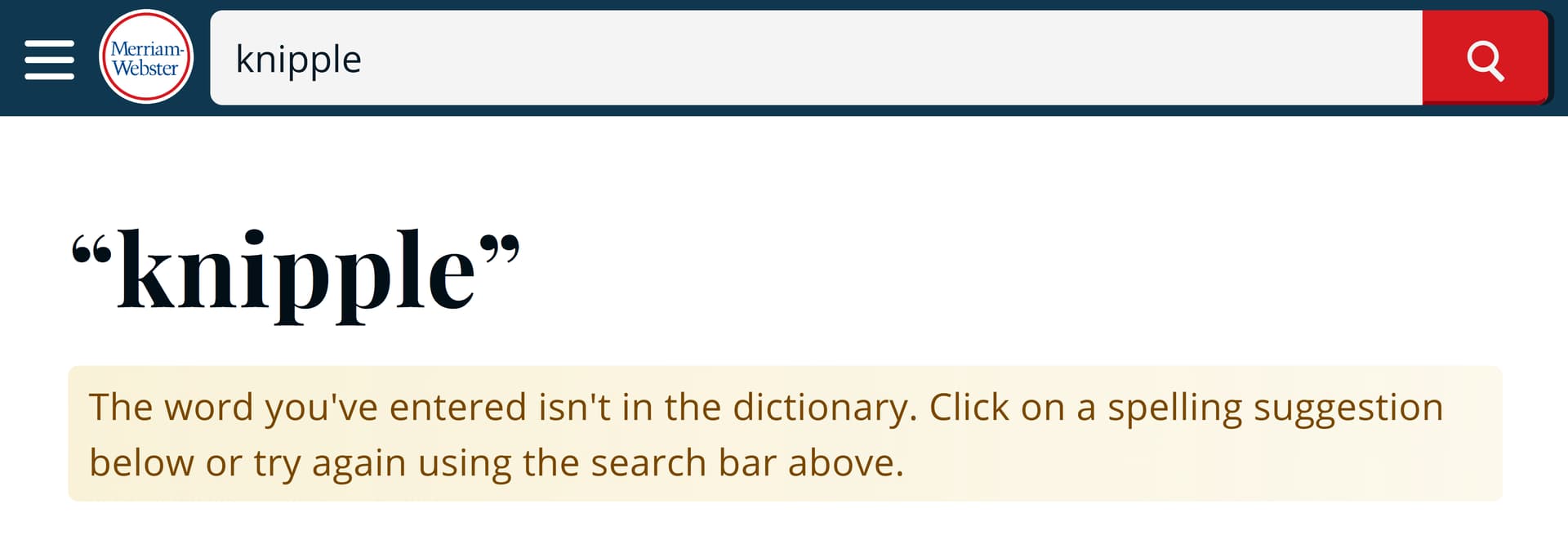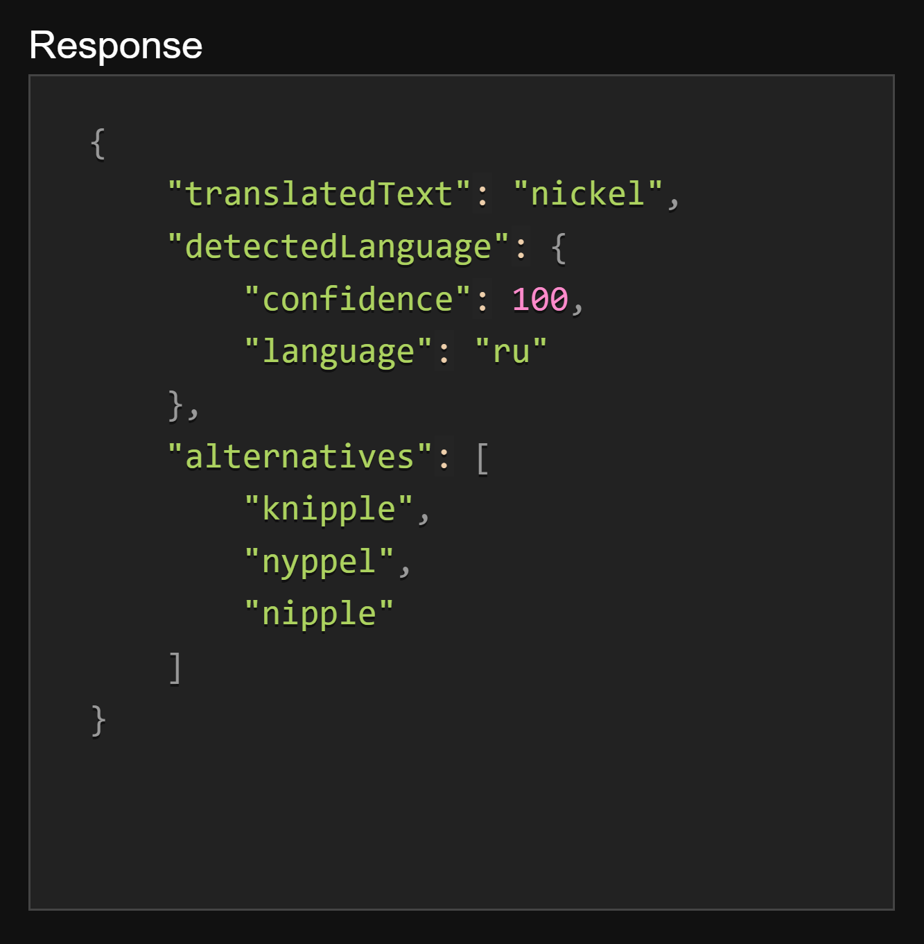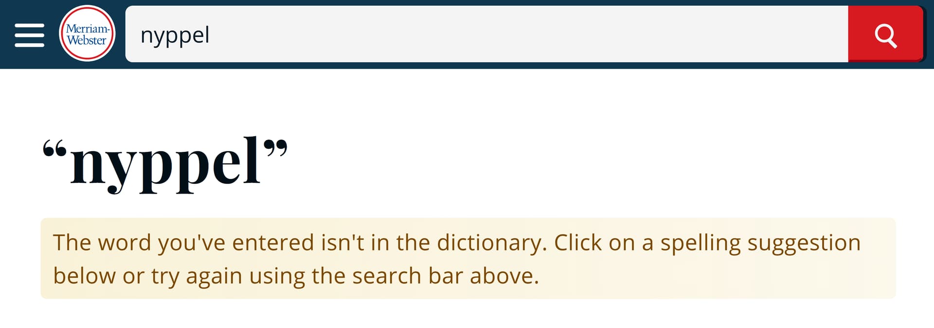 The mistranslation aside, of salient note are the alternatives that are returned above. Two out of the three “English” words LibreTranslate is suggesting as alternate translations (“nyppel” and “knipple”) are not, in fact, English words at all: