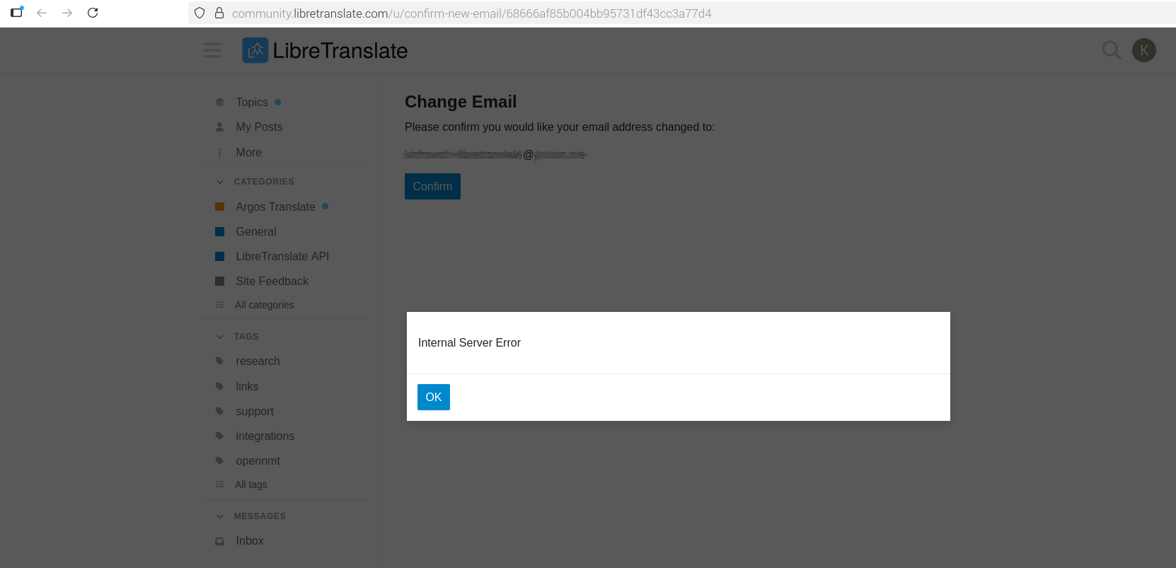 However upon confirming via my email and logging back into the LibreTranslate forum website, the error appeared: Internal Server Error
