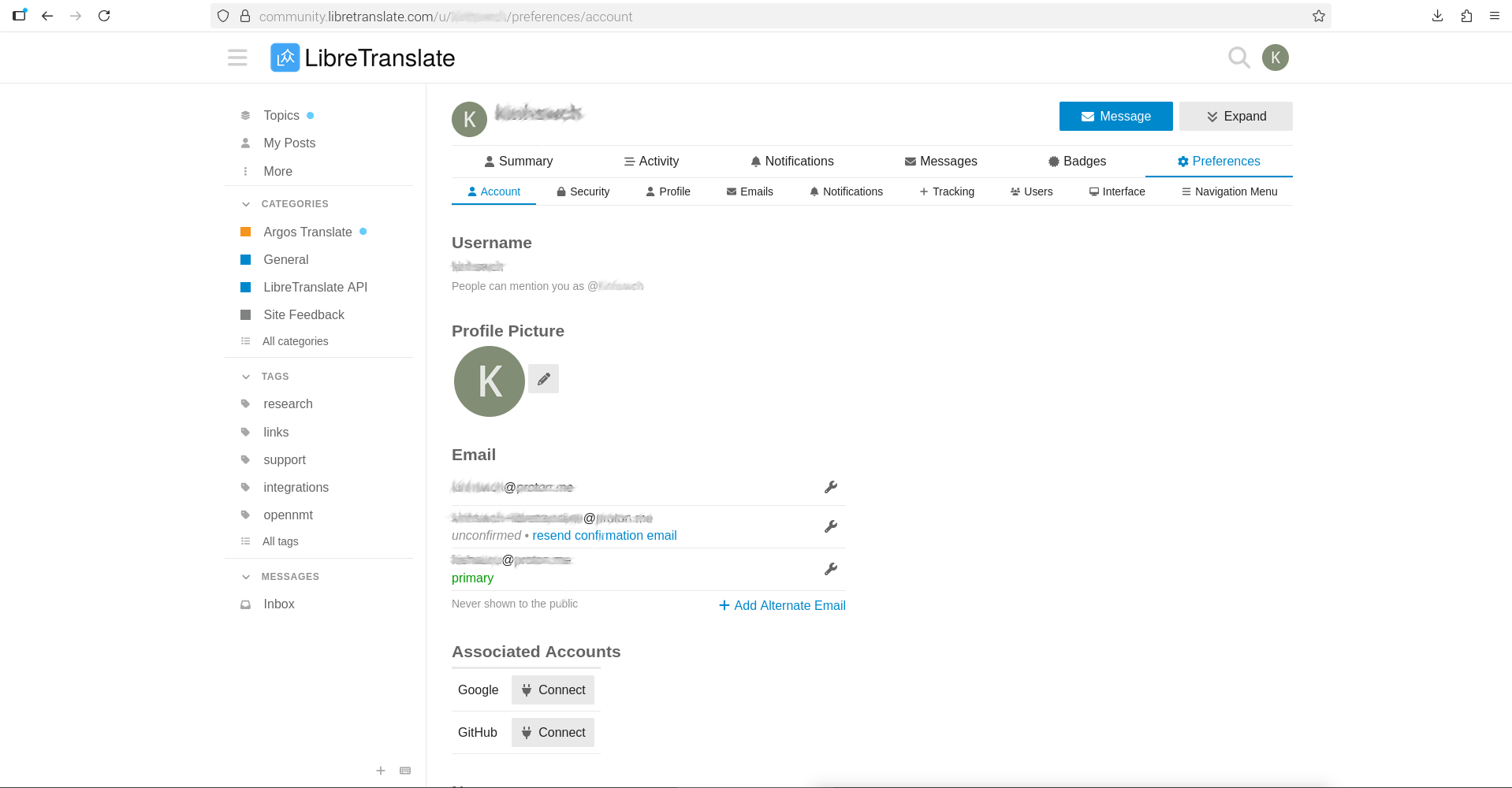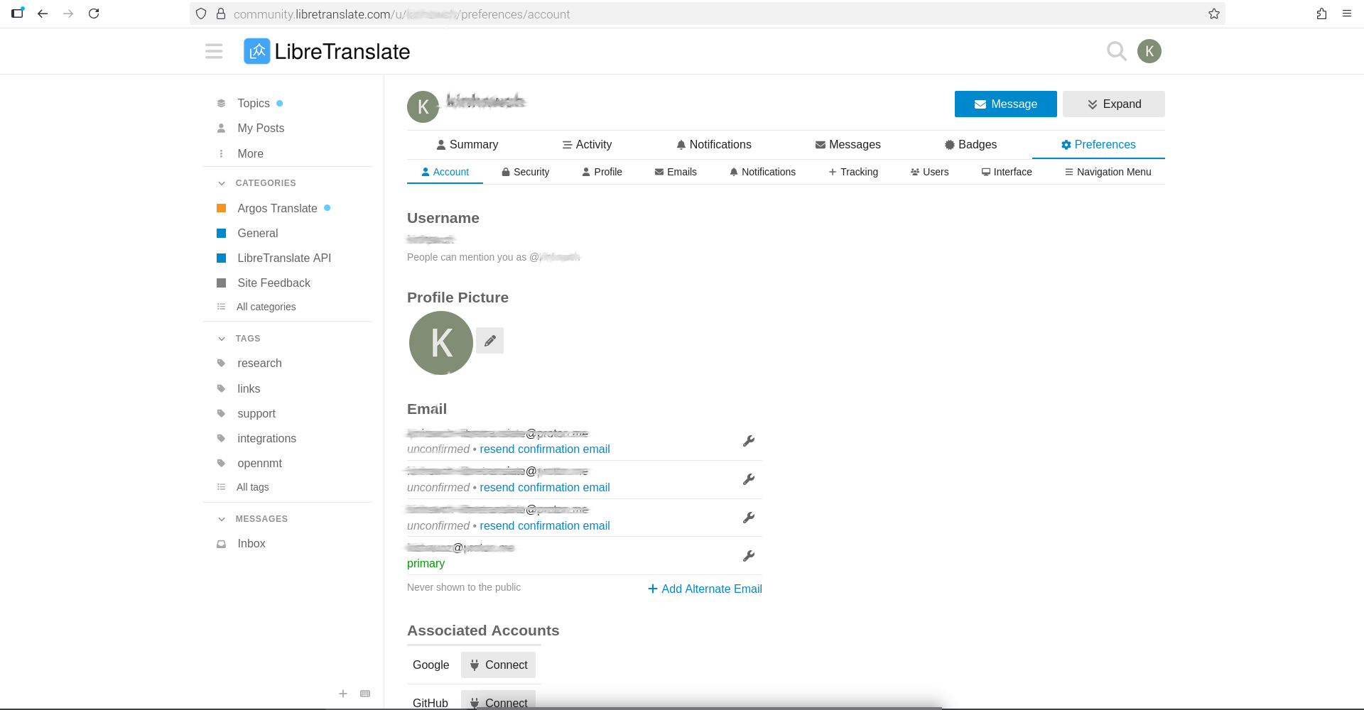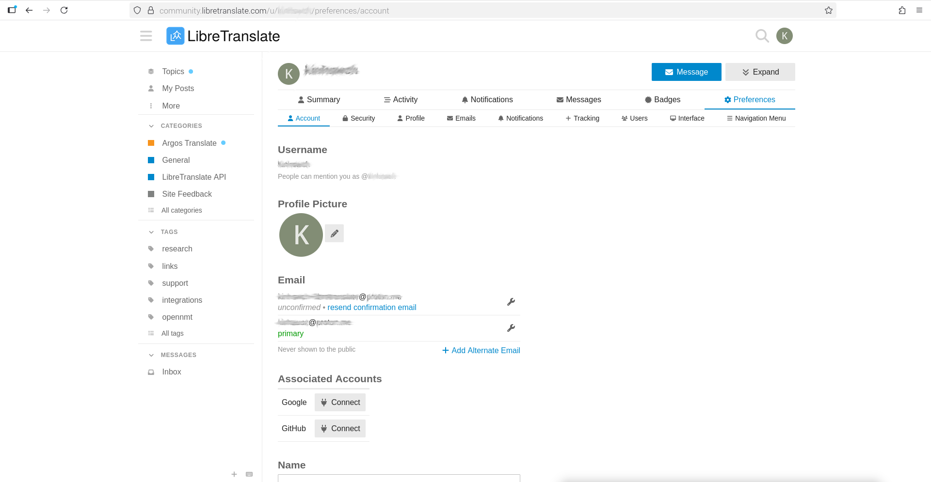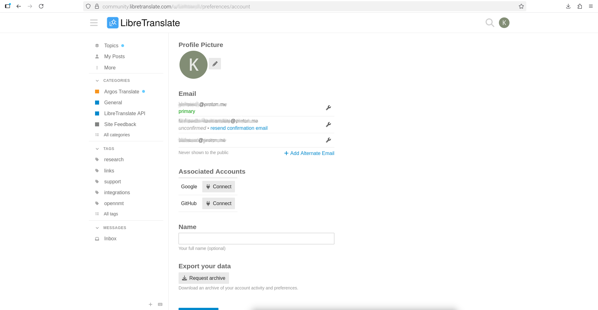libretranslate.com → Profile → Preferences → Email → Add Alternate Email → select confirmation link in new email’s email client → email confirmation link will work or fail → if fail, submit to forum for administrator to update.