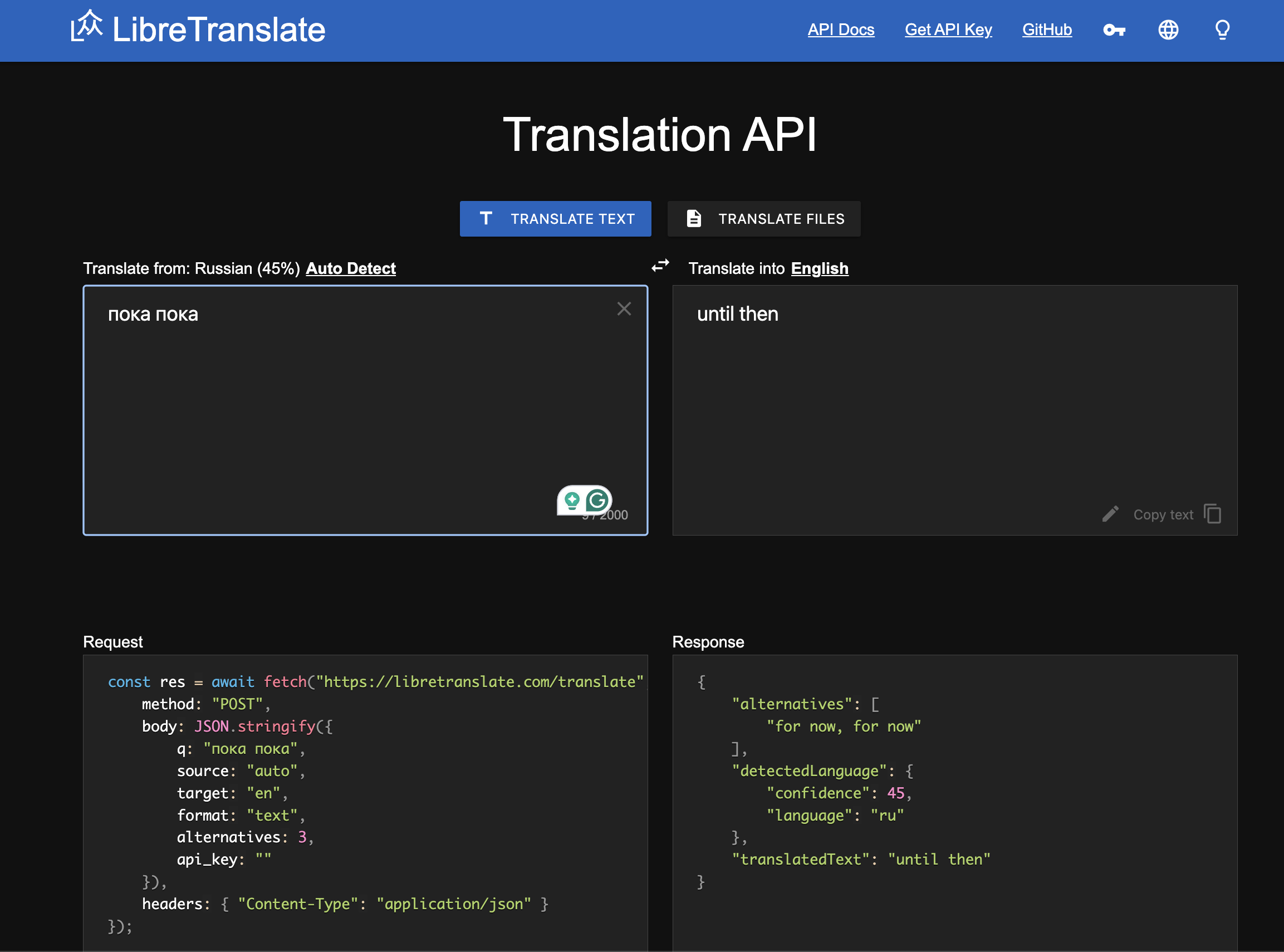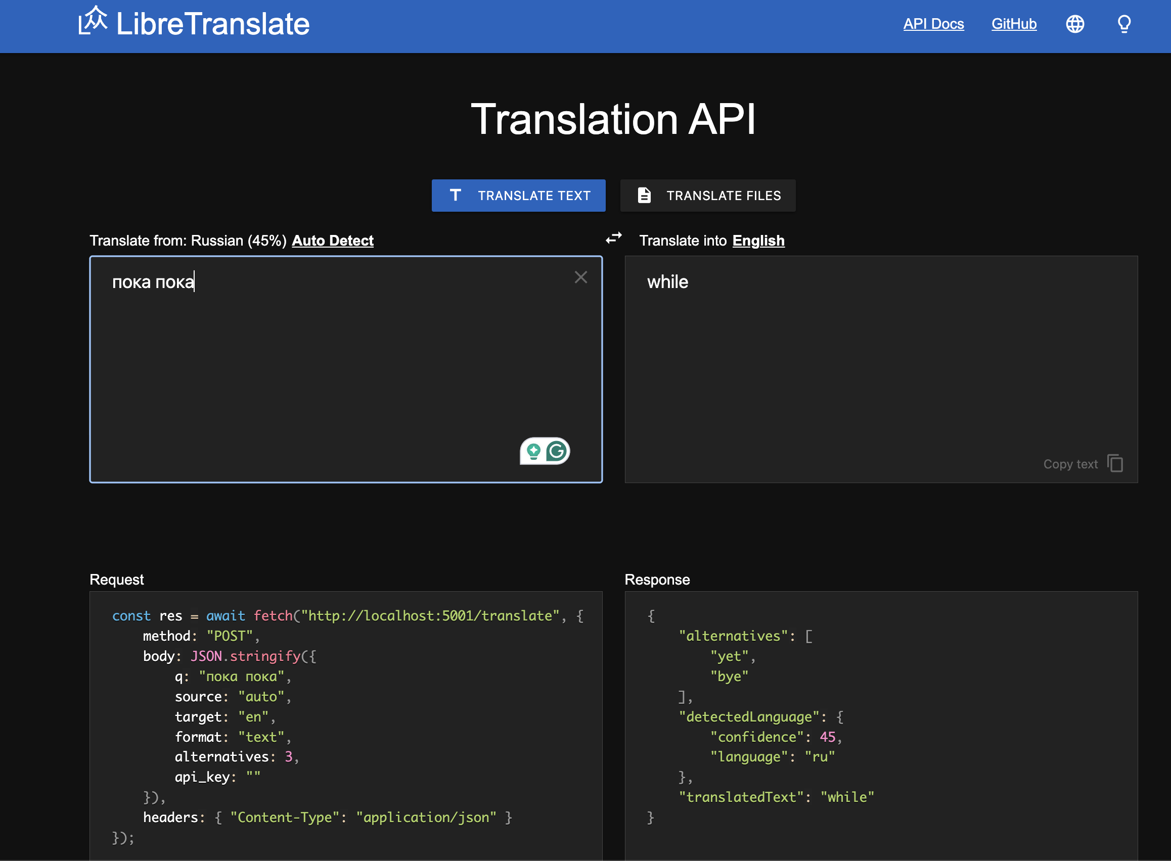 I have attached to screenshots using the same text пока пока (Russia) to english. until then is the response by using the https://libretranslate.com/ site and the while is using the localhost version. I have tried the latest docker image (published 9 days ago) libretranslate/libretranslate:latest, the libretranslate/libretranslate:v1.7.2. and libretranslate/libretranslate:v1.6.